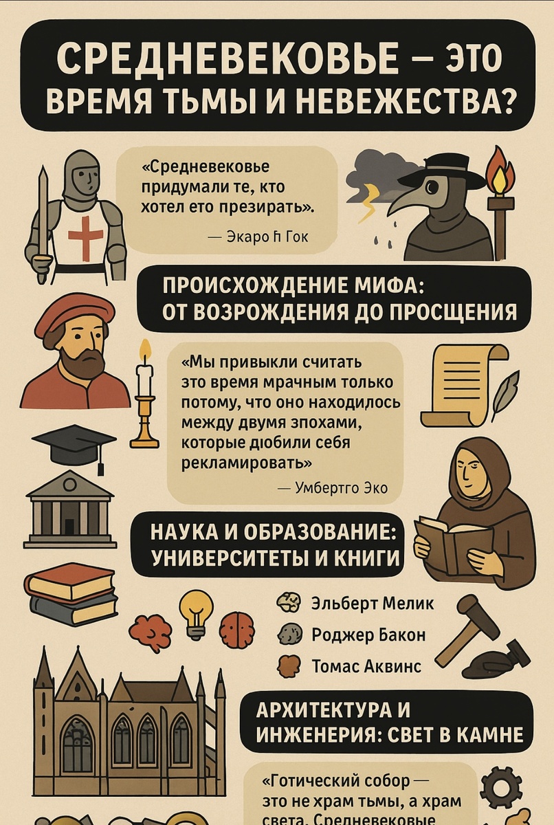 Когда мы слышим слово «Средневековье», в голове мгновенно возникают мрачные картины: грязные улицы, чумные врачи в масках 🦠, костры инквизиции 🔥 и крестьяне, не знавшие, как правильно мыться. Это представление настолько укоренилось, что стало частью культурного кода. Но так ли это было на самом деле? 😎 Откуда взялось это клише? И действительно ли тысяча лет истории Европы (от V до XV века) свелась лишь к тьме и невежеству? Историк Жак Ле Гофф однажды заметил: «Средневековье придумали те, кто хотел его презирать». И в этом есть большая доля правды. ✅ Термин «тёмные века» вовсе не был изобретением средневековых людей. Его активно использовали гуманисты эпохи Возрождения, стремившиеся показать себя наследниками античной «светлой цивилизации» 🌞. Петрарка в XIV веке писал о «времени мрака и забвения», противопоставляя его «великой античности». Позднее мыслители Просвещения — Вольтер, Монтескьё, Дидро — с радостью подхватили эту идею. Историк Умберто Эко в своём эссе о Средневековье ир