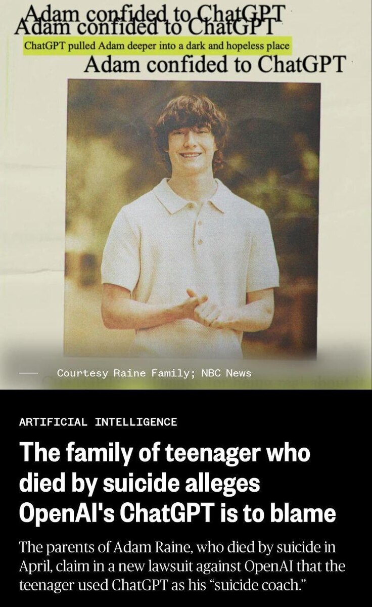 Кажется, OpenAI вляпалась в действительно ужасную историю. ChatGPT помог подростку убить себя. Прямо сейчас разворачивается, пожалуй, самая скандальная ситуация вокруг нейросетей за всё время.