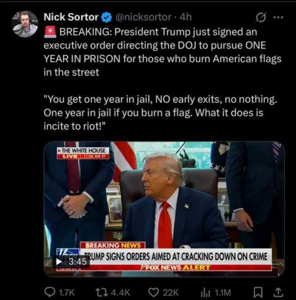 Сжег американский флаг — сел на год в тюрьму Раньше сожжение американского флага в США считалось формой выражения мнения и было защищено Конституцией — уголовной ответственности за это не предусматривалось. Однако недавно Трамп подписал указ, который вводит наказание в виде лишения свободы на срок до одного года и даже без права выхода под залог. Что думаете? Жестко или нормально? 💯 — нормально 🤬 — жестко