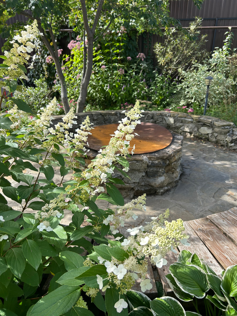 ✅ Декор. Живая изгородь, кустарники, цветники по периметру украсят зону уличного очага и сделают это место по настоящему особенным. В нашем случае вокруг очага растут гортензии, хосты и баданы. Разрастаясь, они смыкаются, и нет необходимости в прополке.