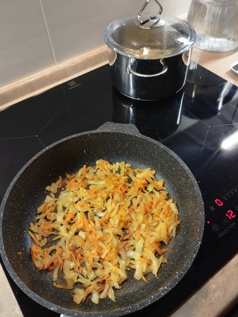 Этим летом, мне кажется, все готовят этот суп. Мы не фанаты супов-пюре, но я решила попробовать. Суп мне понравился, а муж попробовал и не стал есть. Ну, он больше любит классическую еду. Можно все овощи обжарить в одной кастрюле, долить воды и в ней же варить суп. Но я больше люблю обжаривать в сковороде, а суп варить в кастрюле. Я не против того, что испачкается еще и сковорода, она помоется в посудомойке. Для начала обжариваю лук и морковь. Параллельно в небольшой кастрюле варится нарезанный картофель. Я добавила один лавровый лист. Добавила специи и немного соли. Перекладываем зажарку в кастрюлю и обжариваем кабачки кубиками. У меня тут один средний кабачок. Как кабачок немного зажарится, перекладываем в кастрюлю. Убираем лавровый лист и пробиваем все блендером. Добавляем наш главный ингредиент, плавленый сыр. Используем сыр, вкус которого нравится. Я добавила 100-150гр сыра, почти всю пачку. Доводим пюре до кипения, досаливаем, если нужно. Выключаем. Суп вкусный и необычный. Мне