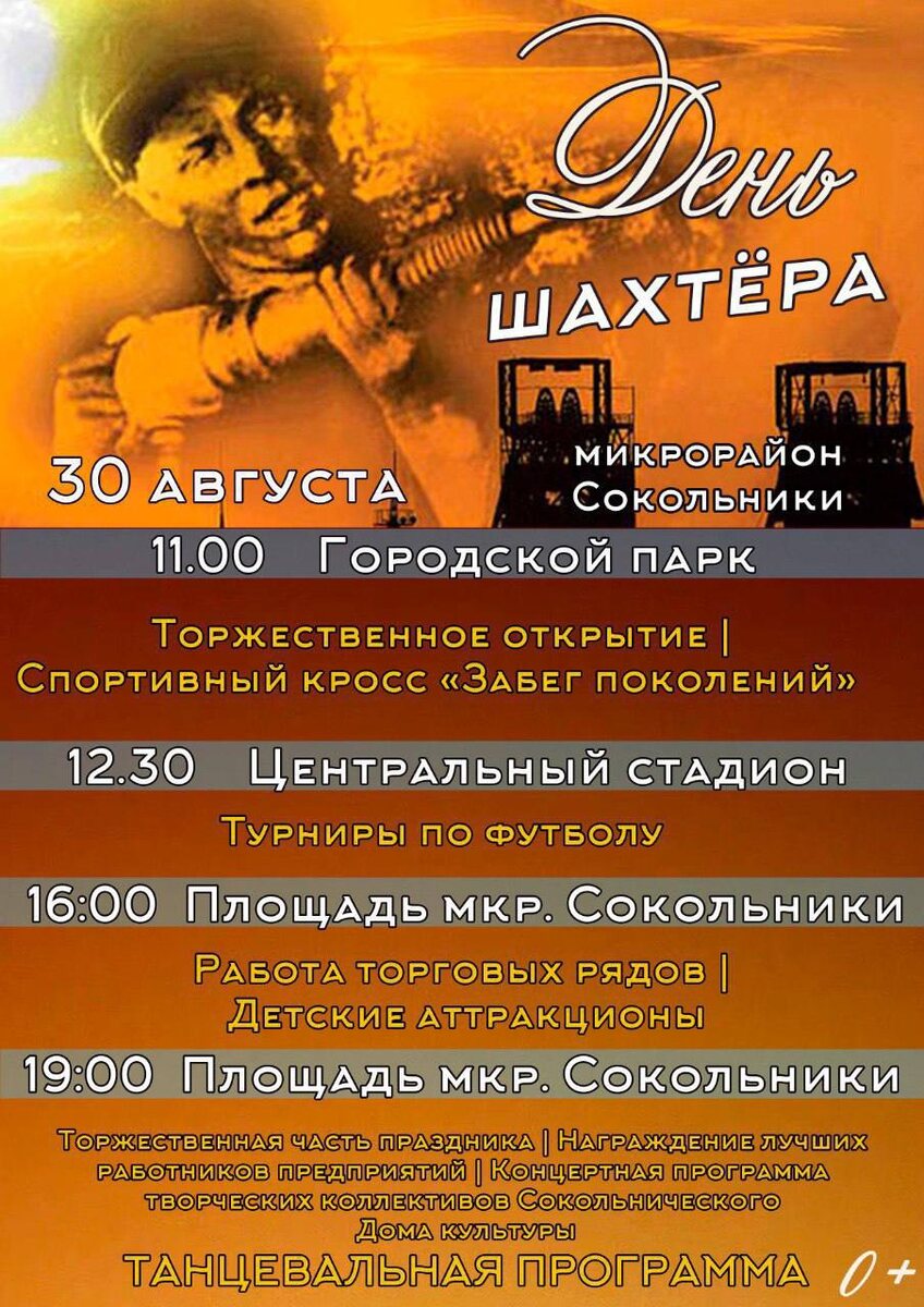 ✅В Сокольниках отметят День шахтера 30 августа: афиша мероприятий Праздник откроется в 11.00 спортивным кроссом «забег поколений», который пройдёт в Центральном парке. Затем на стадионе пройдут турниры по футболу. Для зрителей будут работать торговые ряды, детские аттракционы, пройдёт церемония награждение лучших работников предприятий, концерт творческих коллективов Сокольнического Дома культуры, танцевальная программа 0+.