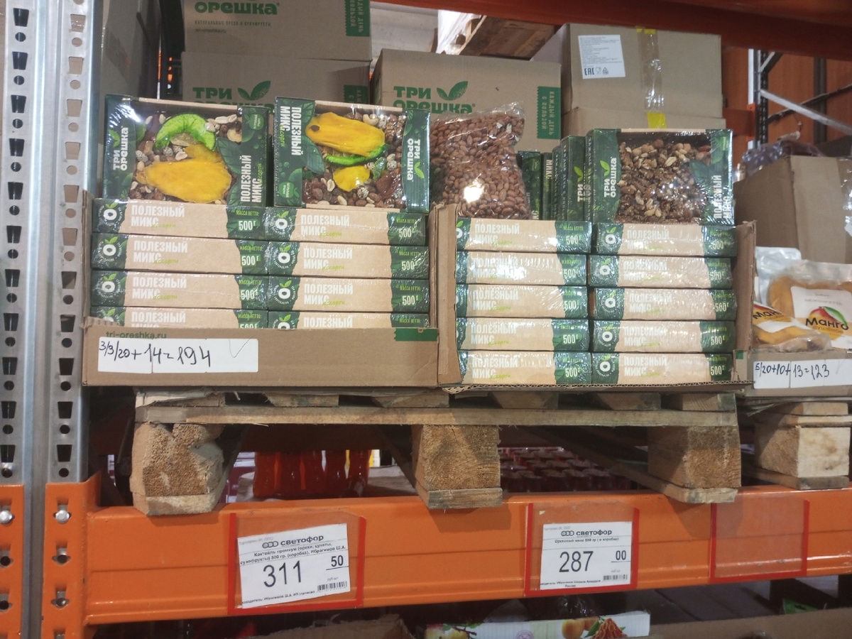 Довелось мне побывать в "Светофоре" в тот момент, когда покупателей практически не было: и прогулялась спокойно по всему магазину, и посмотрела что там в коробках есть и какие новинки привезли. И, признаться, это посещение оказалось одним из самых комфортных за все время, хотя, возможно, на такую оценку повлияло и то, что удалось найти и новинки, и просто хорошие товары. Хоть многие стараются и не покупать ничего съедобного здесь, я все же ко многим продуктам отношусь спокойно, посему в обзоре собраны как раз они, пропустила я в этот раз бытовую химию и всякие товары для дома. Будет здорово, если вы дополните мои отзывы своими, уверена, что некоторые уже пробовали показанные продукты, к тому же некоторые из них продаются не первую неделю. Долгие вступления нам ни к чему, предлагаю сразу и переходить к найденным товарам: Раньше в магазине было лишь ореховое ассорти - выглядит оно красиво, но все дорогие орехи находятся в основном как раз под пленкой, далее идет дешевый арахис или вовсе