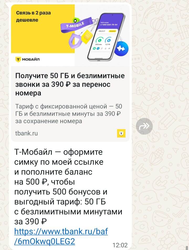 Не ожидал, что так может быть, но вот случилась такая история. Сегодня 27.08.2025 года друг мне скинул на WhatsApp ссылку приглашение оформить сим карту от Т-банка (Т-Мобайл), там бонусы тому кто отправил ссылку и кто оформляет карту при выполнении условий. Мне была нужна вторая карта, и я решил перейти по ссылке и оформить новую. И с этого момента все закрутилось завертелось. Перехожу по ссылке и мне сразу пишут что в течении 20 минут приедет курьер и привезет карту. Я сразу нажал подтверждение и вижу, что оказывается я не новую карту получу, а перенос старой сим карты от другого оператора, а вот это мне было не нужно. Сразу звонок курьера, проситься о встрече, я сообщил, что перенос номера между операторами мне не нужен, а нужна новая карта. Курьер сразу ответил, что все решим и сделаем, как вам нужно. Через пару минут прилетает уведомление: "Скоро наш представитель привезет симку со специальным тарифом ..... за 390 рублей в месяц." Ну думаю, как оперативно. Но вслед др