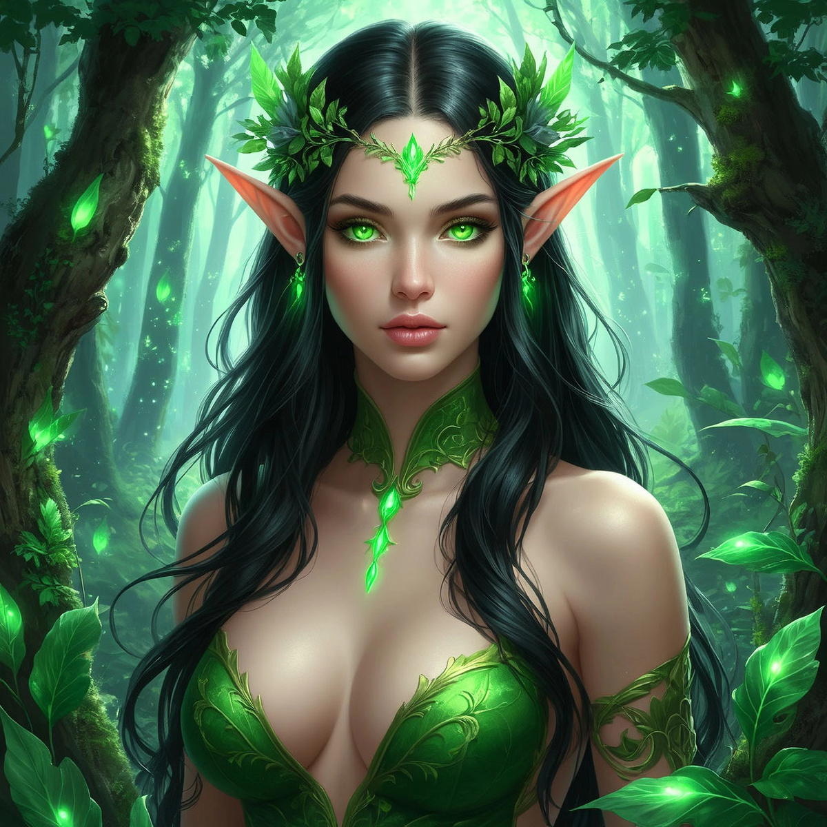 `portrait of a beautiful ethereal elven princess with long black hair and glowing green eyes, intricate floral crown, delicate pointed ears. She is in an enchanted forest with bioluminescent plants, soft mystical light filtering through the trees. Digital painting, fantasy art, highly detailed, sharp focus, art by Artgerm and WLOP.`