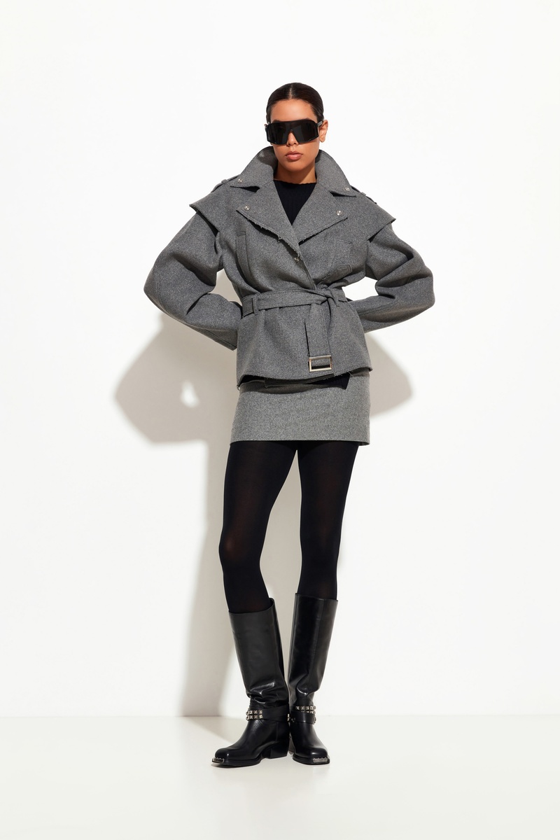 Серое полупальто Lakbi из коллекции осень-зима 2025/26 — стильная модель из качественной шерстяной ткани, которая сочетает в себе тепло и утончённый дизайн. Особенность полупальто — расширенная линия плеч, создающая выразительный и современный силуэт. Модель средней длины обеспечивает комфорт и защиту в прохладную погоду, а благородный серый цвет легко сочетается с разными элементами гардероба.