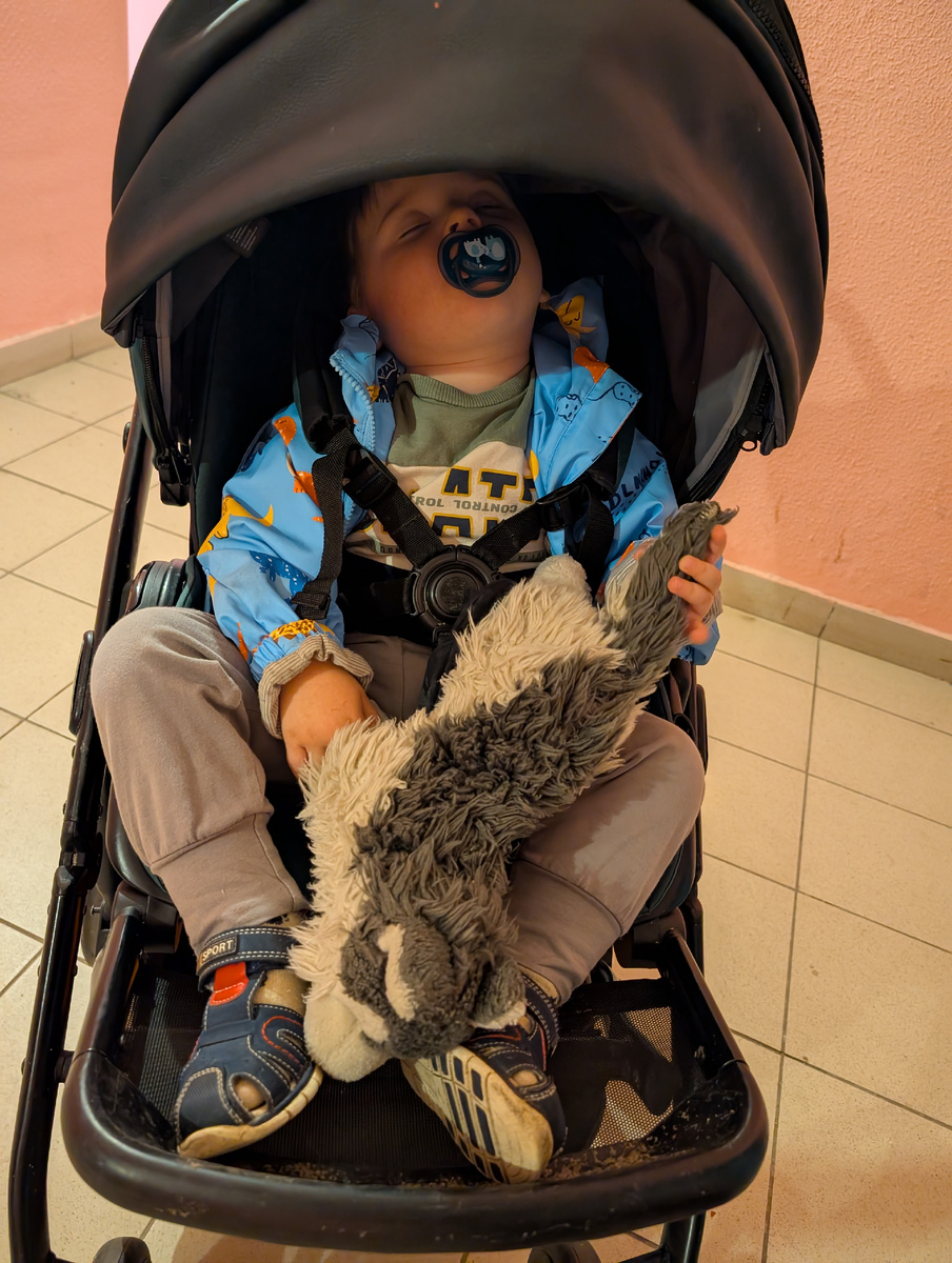 Саша в этот день задал жару: после бассейна он подремал 20 минут и далее спать отказывался. Вот нам уже выходить на собрание через 3-2-1 час, а он так и не поспал. И если его отшлёпать и наругать – тоже не спит. Срубило Сашу уже в 16 часов, за полчаса до выхода в сад. Я одела его прямо в кроватке и вместе с пустышкой и собакой перенесла в коляску. Очень уж интересно, что там будет за собрание.