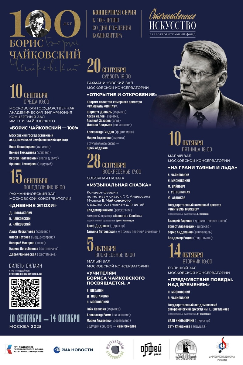 Одно из главных событий нового концертного сезона в мире классической музыки! Благотворительный фонд «Отечественное Искусство» представляет серию концертов к юбилею народного артиста СССР Бориса Александровича Чайковского, которая пройдёт в Москве с 10 сентября по 14 октября при поддержке Президентского фонда культурных инициатив. Уникальная программа, великолепные звёздные артисты, лучшие концертные залы столицы — не просто громкие слова, но правдивое описание проекта «Борис Чайковский. Концертная серия к столетию со дня рождения композитора». Столетие одного из самых значимых композиторов XX века — важное событие в культурной жизни страны.