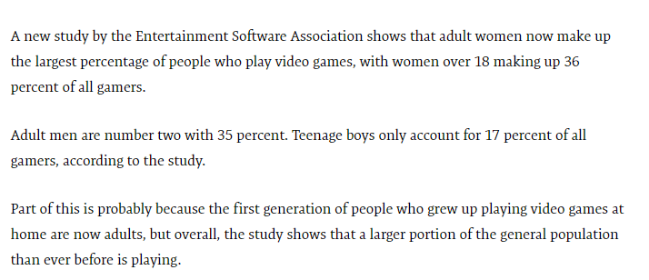 Согласно исследованию Entertainment Software Association (Ассоциация развлекательного ПО), в том году чаще всего играли именно женщины – 36%. За ними с небольшим опозданием шли мужчины - 35%, и всего 17% - подростки-мальчики.