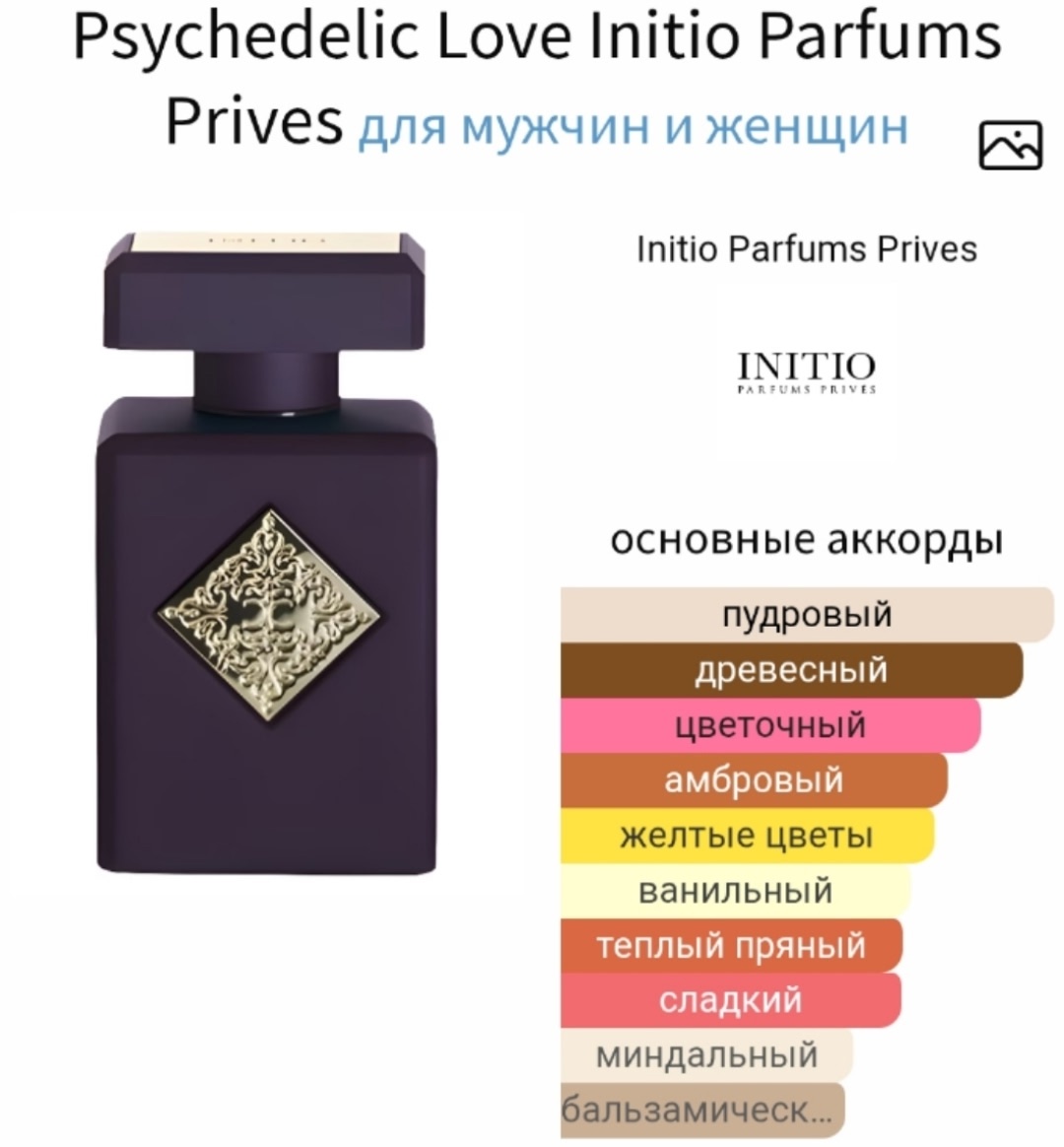 Первые впечатления: вы что сделали, вы как это сделали? Это же какая-то порнография во флаконе! Это так невероятно красиво и мощно, оно же идёт до самой души через обонятельные рецепторы! Что за маньячина это создал? Что за гений? А это Инитио - это относительно молодой французский нишевый бренд. Дорогой, с закосом под "восток", но не являющийся востоком ни в коей мере. Это важно, потому что я долго обходила Инитио из-за их флаконов в стиле "арабская ночь". У меня неперносимость всех арабов, Аттаров, Амуажей и иже с ними. Не моё. Подошла к их белой линейке. Мне понравилось, но не зацепило. Потом "прикоснулась" к их чёрным флаконам - там для меня перебор всего. И наконец фиолетовая серия, к коей относится Psychedelic love. Ну вот же оно, ну вот! То что нужно, как же вкусно! Не оторваться. Сразу скажу, что вся фиолетовая линейка крутая. Но моё субъективное мнение: Психоделик Лав там король в центре, остальные - тени, меркнущие на его фоне. Вернёмся к самому аромату. Психоделика тут одно
