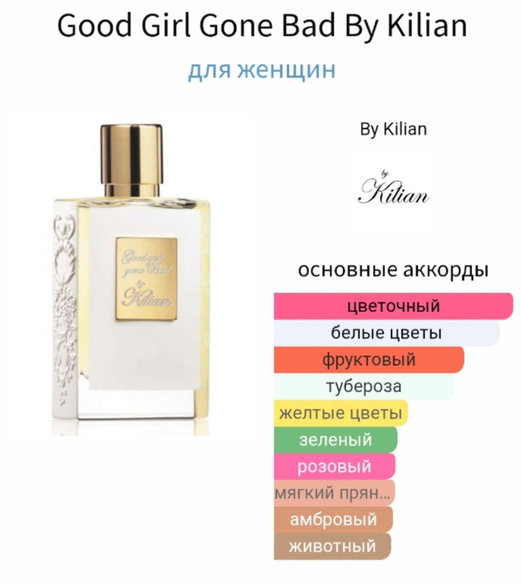 В нем и персик, и табак, и некоторая сливочность. Для меня этот аромат именно про османтус. И если персик Форда Bitter Peach откровенно про фрукт, то "девочка" Килиан - это цветы с легкой фруктовостью. Любовь с первого затеста. Легкий и нежный, но стервозный парфюм, с явным характером. Будто милая дама, глядя на которую, можно абсолютно точно сказать - это не беззащитная кошечка. Но она так хочет такой казаться. Железный кулак в бархатной или атласной перчатке. Аромат Good girl gone bad не идет впереди вас, не открывает дверь с ноги. Не заявляет о себе громко, но приходит мягкой поступью, и его точно услышат. Услышат, заметят, захотят ощутить поближе. Нет размашистого шлейфа и удушающих нот.