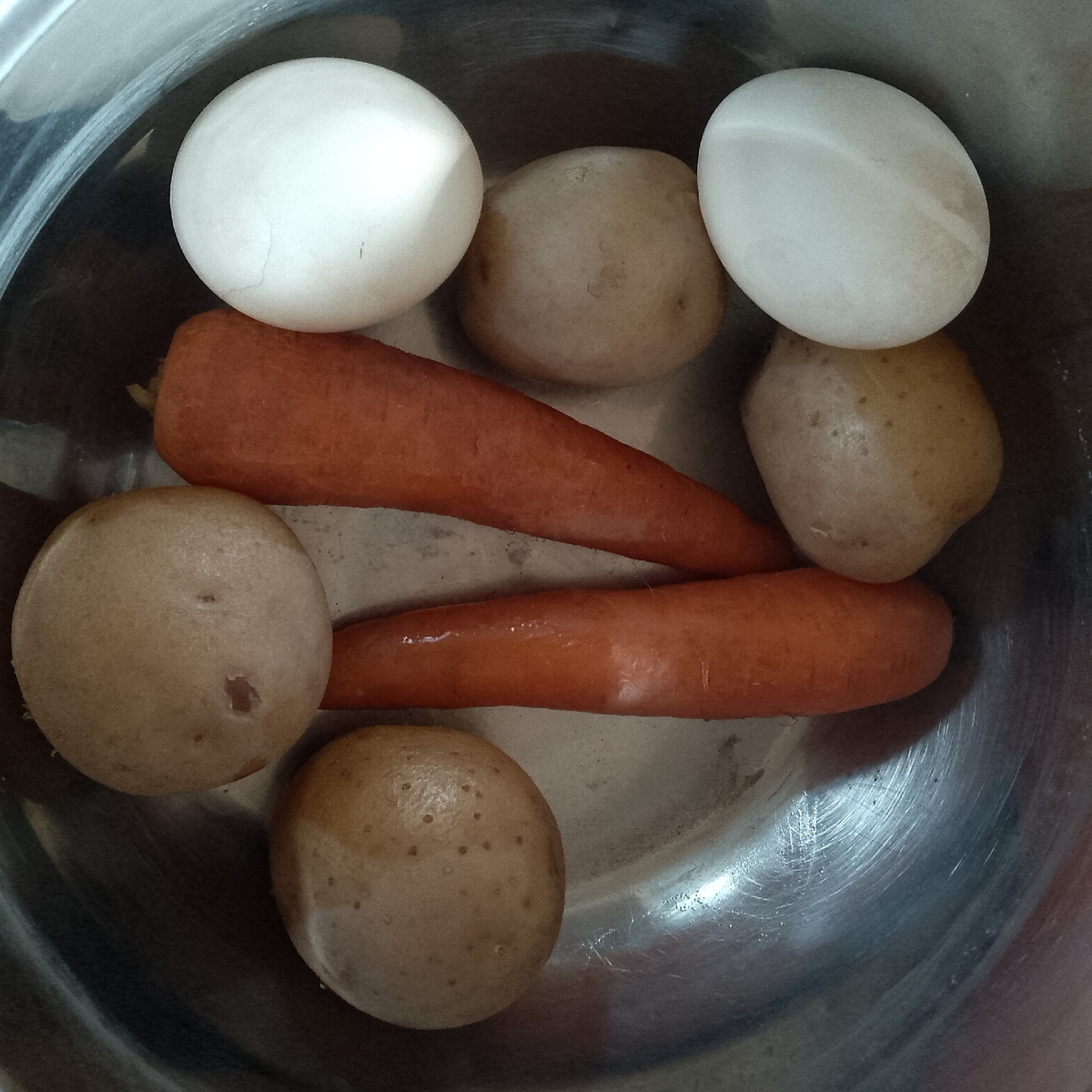 Кваса у меня много, а ингредиентов для окрошки не хватает. Нет колбасы, зелени, редиски, но не беда. Сварила 4 картошки, 2 морковки и 2 яйца. Нарезала лука красного и белого побольше и помяла его для сочности руками с небольшим количеством соли. Зелени тоже нет вместо неё сухой укроп. Как обычно мелкий кубик и перемешала. Уже положила в свою любимую миску и залила квасом. Нравится горчицу добавить или @рен, а могу и вместе сделать. Сахар, соль. Майонез обязательно. Села есть и понимаю, что забыла огурцы потереть. Вот, что бывает когда голова не тем забита. Добавила огурец себе в тарелку. Поела и потом доделала всю окрошку. У меня немного её. Есть одной. Собаке не даю, конечно. Квас на своей закваске из хлеба с добавлением сусла поэтому такой темный. Насыщенный, вкусный, не даром домашний. Окрошка и такая мне понравилась. С колбасой отлично, но можно и так, а зелени явно не хватает и редиски. Морковь я как-то случайно попробовала добавить картошки мало было и со свеклой делала. Мне н