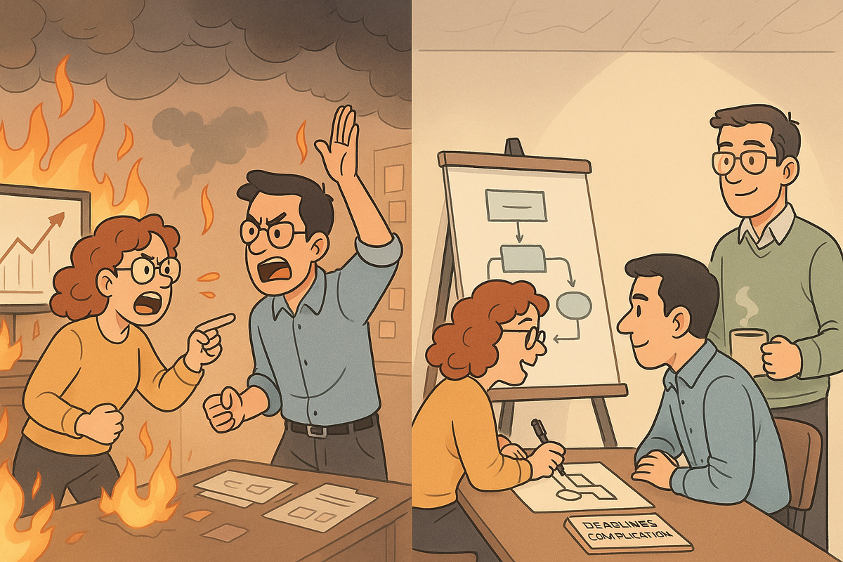 Конфликт — это не поломка, а сигнал. И задача руководителя — не тушить пожар, а разобраться, что именно загорелось, и почему.