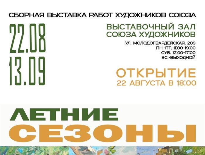 В пятницу, 22 августа, в 18:00 в Выставочном зале СРО ВТОО "Союз художников России" (ул. Молодогвардейская, 209) открывается сборная выставка работ художников Союза "Летние сезоны" (16+). Самарское отделение Союза художников России приглашает на сборную выставку "Летние сезоны", которая объединила плоды вдохновенного летнего труда 55 творцов. Экспозиция, включившая более 130 работ, - это яркий калейдоскоп впечатлений, собранных нашими мастерами в самых разных уголках России. Крымские пейзажи, залитые южным солнцем, астраханские просторы, овеянные ветрами каспийских степей, поэтичные тропинки Абрамцево и Тархан, легендарные берега Ширяево, тихие тропы Рождествено, живописные окрестности Подгор и Винновки - вот лишь малая часть тех мест, куда стремится творческая душа художника в поисках новых тем, интересных сюжетов и ярких впечатлений.