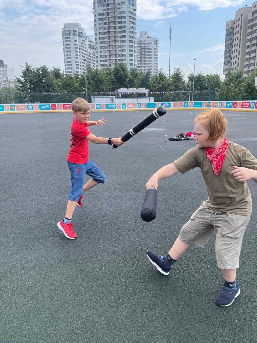 На смене летнего клуба, посвящённой Шреку 🐸, у нас в “Бухте” прошёл рыцарский турнир ⚔️, после которого мы поняли: да у нас же есть столько настоящих рыцарей! 👑 Пора открывать школу владения мечом. 🏰 Буквально недавно у нас прошла первая пробная тренировка по историческому средневековому бою. 🛡 Это новый, молодой вид спорта, который быстро набирает популярность. 🌟 Он интересен многим взрослым и детям, но если взрослые сражаются в настоящих доспехах со стальными мечами ⚔️, то детям, чтобы поучиться, дают мягкую амуницию. 🥋 Мечевой бой - это отличный способ выплеснуть энергию 💥, а может, и скрытую агрессию. 😤 Однако первое, чему мы уделяем много внимания на занятиях - это, конечно же, безопасность. 🛡 У ребят вместо настоящих мечей - пенопластовые дубинки, которые называются “тямбары”. 🥳 Нанести травму такой штукой невозможно, однако мы учимся защищаться: стоять в стойке, держать дистанцию, парировать удары. 🤺 Самое главное - ребятам интересно! 🎉 Отличный вид физической а