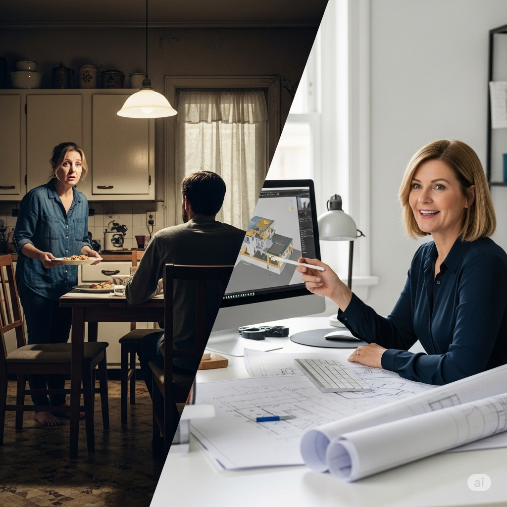 На следующий день Света решилась на эксперимент. Вместо привычной уборки она села за компьютер и начала рисовать. Давно забытые навыки постепенно возвращались. Через несколько часов на экране красовался эскиз интерьера гостиной.