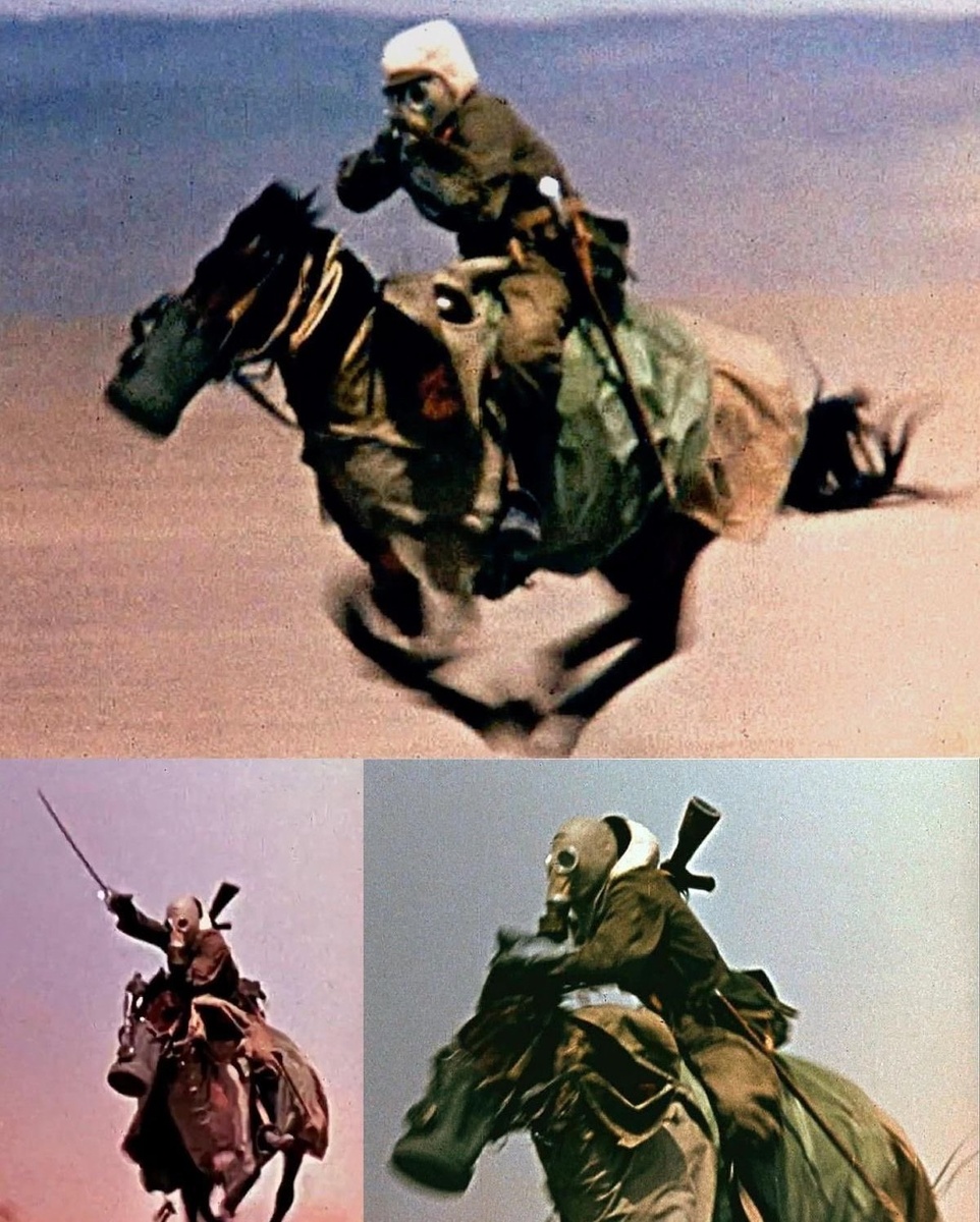 Всадник ядерного апокалипсиса. Вот буквально. У этих снимков из архива CCTV (тогда Телевидение Пекина) яркая и пугающая история. 16 октября 1964 года Китай провел первые успешные испытания ядерного оружия, чем обозначил свое вступление в гонку вооружений. Конечно, все было задокументировано на пленку. И вот для пущей патетики китайские кинематографисты придумали такой ход. После кадров ядерного гриба и разрушений макетов домов они пустили нарезку с конницей НОАК в противогазах. И всадник, и лошадь в костюмах химзащиты. Шашка наголо. Стрельба из карабина. В общем, максимально эффектно. Даже сегодня выглядит очень угрожающе.
