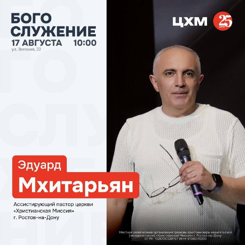 БОГОСЛУЖЕНИЕ 17 АВГУСТА В 10:00 ⛪️ Приходите на встречу с Господом, провести время в молитве, единстве и общении Богослужение проведет ассистирующий пастор церкви «Христианская Миссия» г. Ростов-на-Дону - Эдуард Мхитарьян 🙌 Обязательно запланируй это время, ведь Господь ждет и готовит важное Слово! до служения проходит молитва в 9:30 ждем вас «Шесть дней ешь пресный хлеб, а на седьмой день проведи собрание Господу, твоему Богу, и не делай никакой работы.» Второзаконие 16:8 НРП Благословляем вас и приглашаем на богослужение! Адрес: Зеленая 22 🖥 ВКонтакте «Цхм Ростов» трансляция служения — https://vk.com/cxm.rostov 🖥 РУТУБ «Цхм Ростов» трансляция служения — https://rutube.ru/channel/39499224/ 🖥️ YouTube «Цхм Ростов» трансляция служения - https://youtube.com/@cxmrostov?si=gSKP3_oMbfVza0gg