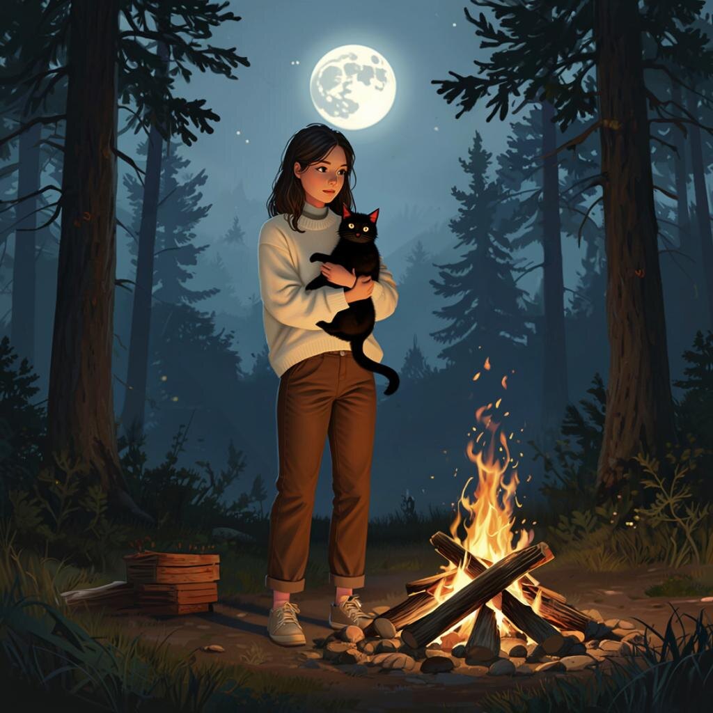 Я вышла из машины, держа в руках мешок с тетрадью. Мы с Багирой углубились в лес, пока не нашли подходящую поляну, окруженную высокими соснами. Земля здесь была усыпана сухими ветками и опавшей хвоей – идеальное место для костра.