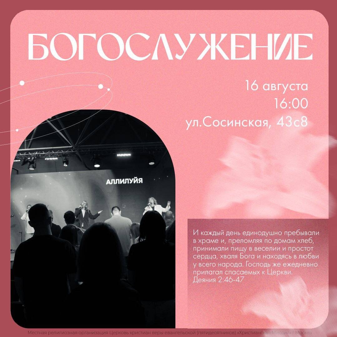 Дорогие братья и сёстры! Приглашаем вас на Богослужение! 🤩 16 августа / 16:00 / улица Сосинская, 43с8 Вместе мы будем поклоняться Ему, наполняться Его присутствием, радостью и миром, а также укрепляться через живое и действенное Слово Божье. Сам Господь обещает: «Придите ко Мне все труждающиеся и обременённые, и Я успокою вас» (Матфея 11:28). До встречи!🔥