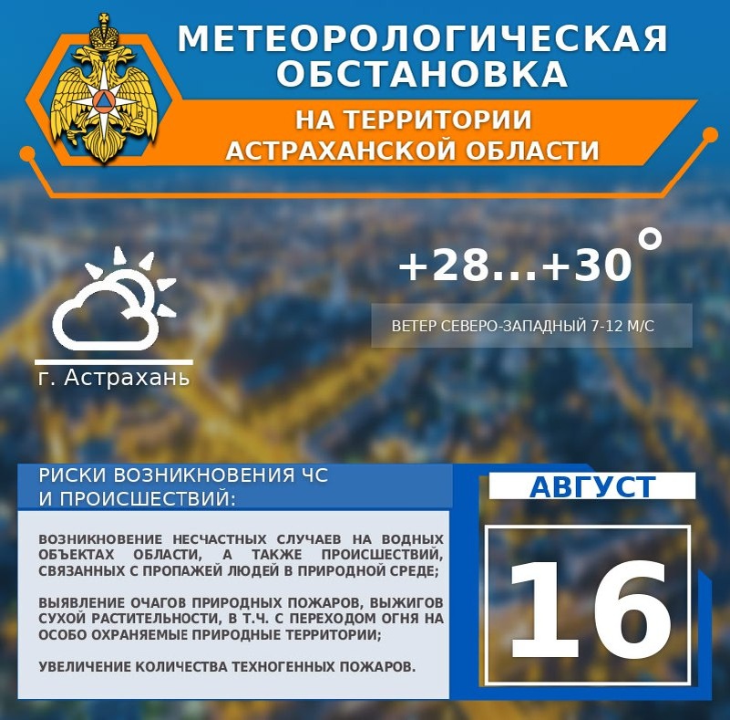 🌤По г. Астрахань переменная облачность. Без существенных осадков. 🌬Ветер северо-западный 7-12 м/с. 🌡Температура воздуха днем +28...+30°, ночью +16...+18°.