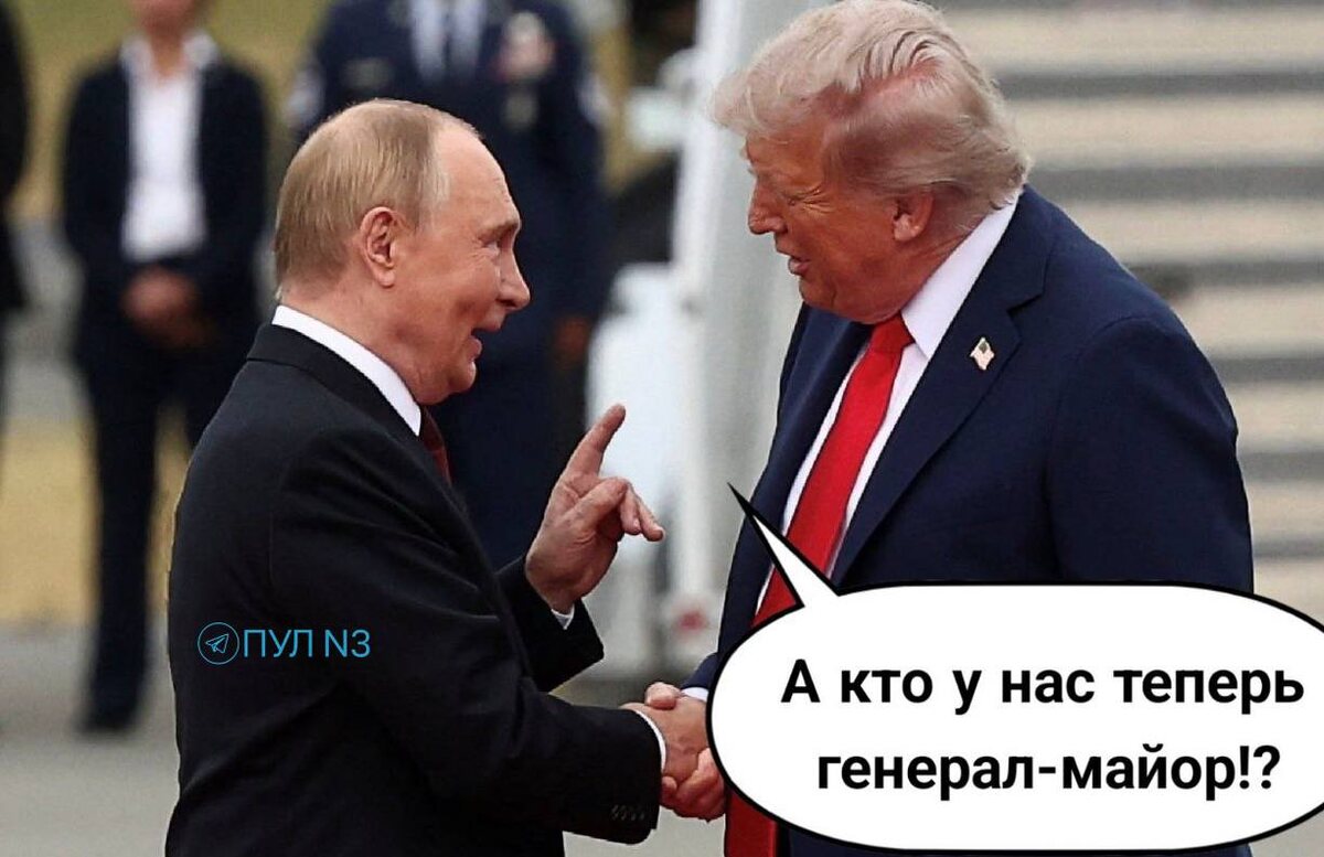 Приветствие Путина прозвучало мрачновато, на мой взгляд. Докладываю. Многие российские СМИ и блогеры (и я в их числе на своем канале в телеге) обратили внимание на момент встречи Путина и Трампа, когда наш Президент что-то назидательно сказал коллеге, подняв палец вверх. Этот момент моментально породил кучу мемов в сети. Вот, например, шутка от канала Пул №3: Но всё оказалось еще круче. На итоговой конференции Владимир Путин сам поведал, что сказал Трампу: "Добрый день, дорогой сосед. Очень приятно видеть Вас в добром здравии и живым". И вроде бы хорошее, доброе приветствие. Если бы не вот это вот последнее "...и живым". Это что? Отправка к неудавшемуся покушению или к почтенному возрасту Трампа? Вкупе с поднятым вверх пальцем, звучит немного зловеще, как мне кажется. Ну ладно, это всего лишь мои мысли. А что там с итогами? Главный итог на пресс-конференции озвучил господин Трамп (его цитата): - Мы не смогли найти полного понимания. К сожалению, пока сделки нет. Я буду созваниваться