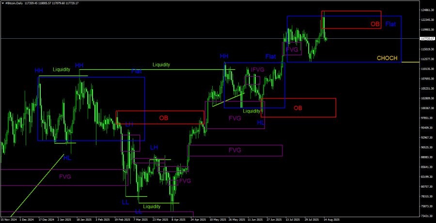https://basechop.ru/wordpress/?p=54310 Биткоин продолжает «рисовать» очень интересную картину. Пожалуй, именно биткоин сформировал наиболее интересный сет сигналов, которые дает возможность предполагать определенное движение с вероятностью выше 50%. Напомним, что области FVG – это лишь области неэффективного ценообразования. Цена может даже не возвращаться к ним, может игнорировать их. По сути, FVG – это сигналы, но не самые сильные, в продолжение тренда или коррекции. Зато Order-block, как правило, указывает на смену тенденции. Снятие ликвидности – на смену тенденции. Девиация флэта – на движение к противоположной границе бокового канала. И в данное время по биткоину сформировались все три из вышеперечисленных сигналов. Таким образом, мы считаем, что падение «цифрового золота» будет продолжаться, как минимум, к нижней границе флэта – к уровню 111 800$. Возможно, мы даже находимся в самом начале нисходящего тренда. В идеальном варианте следует дождаться возврата к Order-block, его…