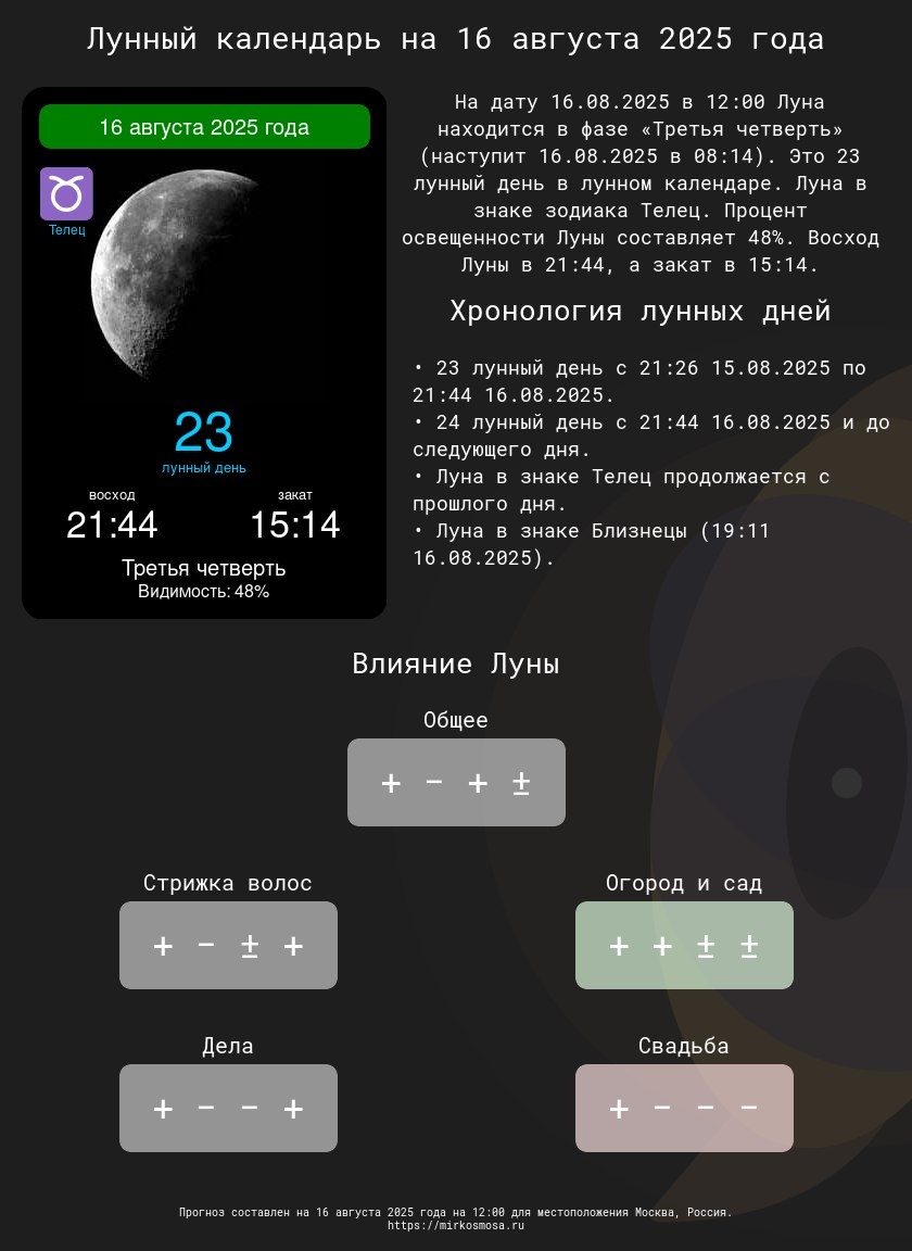 Лунные календари на 16 августа 2025 года: Подготовьтесь к этому дню с учетом влияния Луны! 🔹🌗 Лунный календарь на 16 августа 2025 года — Что приготовила Луна? Подробнее 🔹✂️ Лунный календарь стрижек на 16 августа 2025 года — Подходящий ли день для обновления прически? Подробнее 🔹🌱 Лунный календарь огородника и садовода на 16 августа 2025 года — Лучшее время для ухода за растениями. Подробнее 🔹📅 Лунный календарь дел на 16 августа 2025 года — Удачные моменты для важных задач. Подробнее 🔹💍 Лунный календарь свадеб на 16 августа 2025 года — Подходит ли этот день для вашего торжества? Подробнее