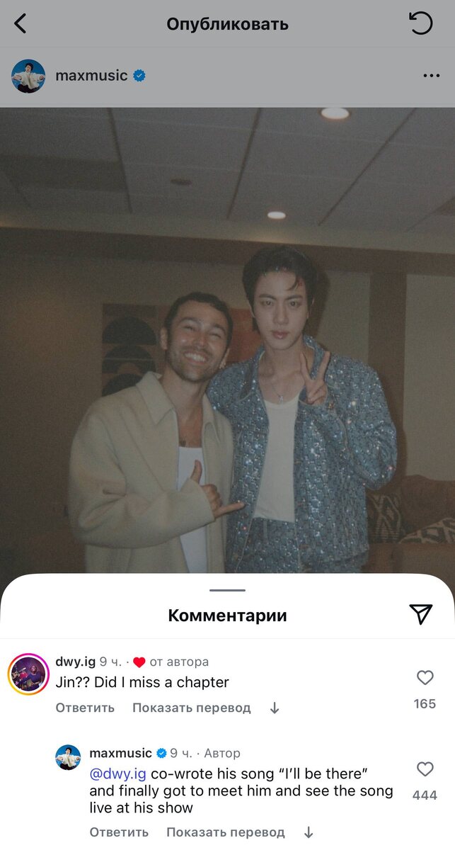 Π ΠΎΡΠ²Π΅Ρ Π½Π° ΠΏΠΎΡΡ π Max ΠΎΡΠ²Π΅ΡΠΈΠ» Π½Π° ΠΊΠΎΠΌΠΌΠ΅Π½ΡΠ°ΡΠΈΠΉ ΠΏΠΎΠ΄ ΡΠ²ΠΎΠΈΠΌ ΠΏΠΎΡΡΠΎΠΌ Π² Instagram: ΠΠΎΠΌΠΌΠ΅Π½ΡΠ°ΡΠΈΠΉ: ΠΠΆΠΈΠ½? Π― ΠΏΡΠΎΠΏΡΡΡΠΈΠ» ΠΊΠ°ΠΊΡΡ-ΡΠΎ Π³Π»Π°Π²Ρ? Max: Π― ΡΠΎΠ°Π²ΡΠΎΡ Π΅Π³ΠΎ ΠΏΠ΅ΡΠ½ΠΈ "I'll be there", ΠΈ Π½Π°ΠΊΠΎΠ½Π΅Ρ-ΡΠΎ Ρ Π²ΡΡΡΠ΅ΡΠΈΠ» Π΅Π³ΠΎ ΠΈ ΡΡΠ»ΡΡΠ°Π» Π΅Ρ Π²ΠΆΠΈΠ²ΡΡ Π½Π° Π΅Π³ΠΎ ΠΊΠΎΠ½ΡΠ΅ΡΡΠ΅. #JIN @kumihobts