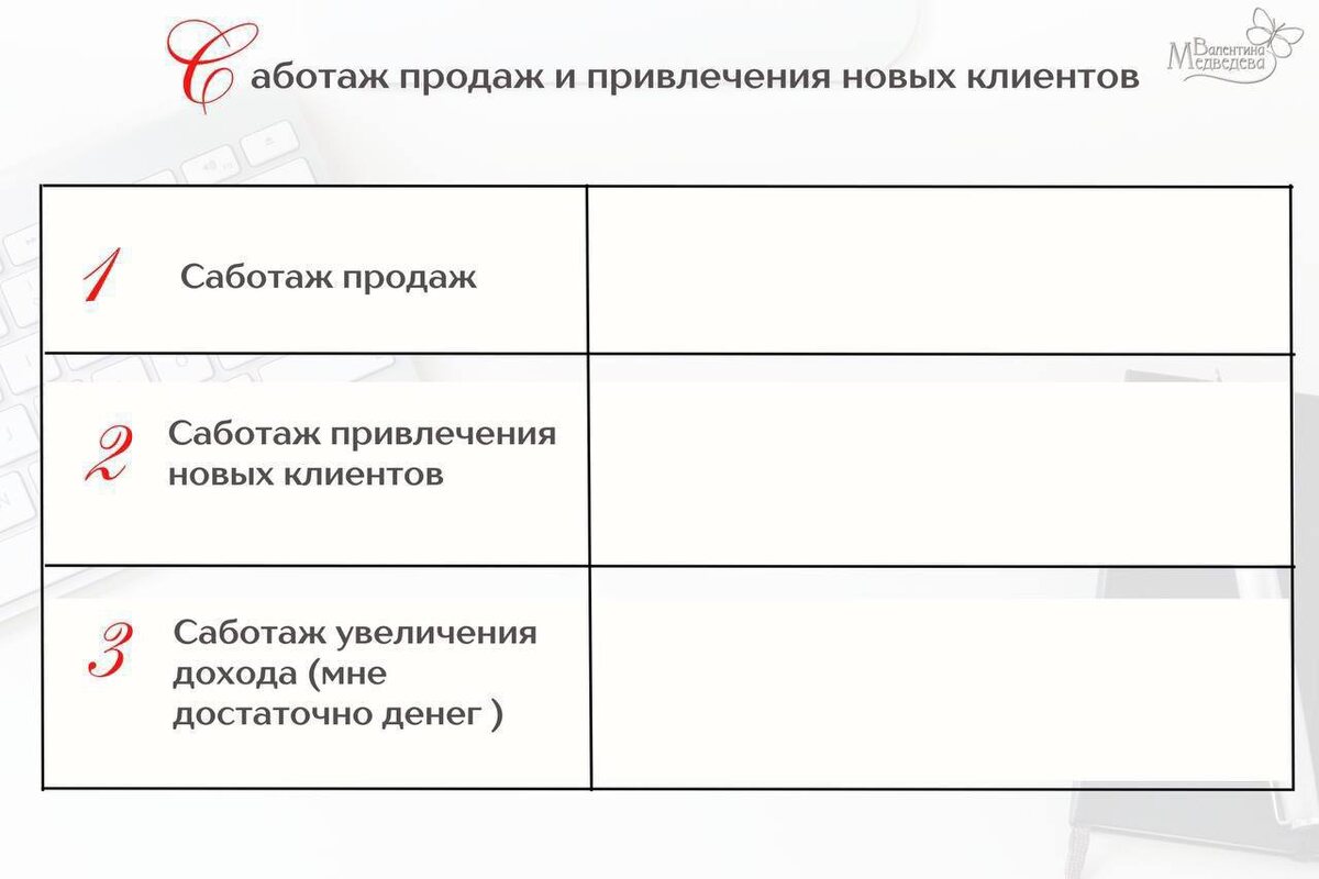 Сегодня 2 день флешмоба и мы работаем с темой саботажа продаж , клиентов и денег … ✅Сегодня ваша задача понять , где вы саботируете свое вырастание в большие доходы , рост продаж и выход на новый уровень клиентов . ▶️Саботаж вырастать и двигаться в новое есть у всех! Под саботажем и сопротивлением лежит страх! ❗️Нам страшно выйти на новый уровень денег, клиентов, продаж Предлагаю сделать практику на листе бумаги и прописать что саботируете🔥 Саботаж: - оставляет человека в старой зоне комфорта - помогает цепляться за старых клиентов - мешает расти в деньгах - снижает самооценку - убегание в страдания и состояние жертвы - мешает росту и развитию - блокирует продажи в прямых эфирах - становиться блоком в коммуникации с новыми людьми и т.д Сделайте практику и заполните табличку и напишите что получилось у вас👇🏻