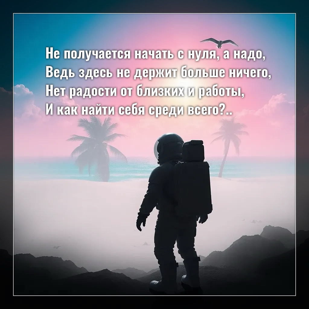 Не получается начать с нуля, а надо, Ведь здесь не держит больше ничего, Нет радости от близких и работы, И как найти себя среди всего? Настолько уже Душу «затолкала» В огромный, тёмный угол изо лжи, В иллюзиях жила так долго, Ну вот теперь совет держи - Меняться никогда не поздно, Менять можно работу, окружение, Менять можно даже страну и город, И бегать до изнеможения, Но от себя совсем не убежишь И тут нужно внутри понять, Хочу ли я, как прежде жить? Или желаю что-то поменять. Если желание есть - меняй. Не бойся боли, криков и потерь, Ведь прежде, чем рассвет увидеть, Как минимум должна открыть ты дверь, Чтоб выйти из привычных стен И красоту заметить, что вокруг Тебя всегда была и развивалась, Но ты сама себя здесь посадила в круг, Который оказался бесконечным, И вот уже весь свет не мил, А что тебе весь свет-то сделал? Тебя «затёр» уроками до дыр? А почему ты им сопротивлялась, А не использовала в помощь, и как дар? Теперь кто виноват? Виновных нет, Пора проснуться просто, выпуст