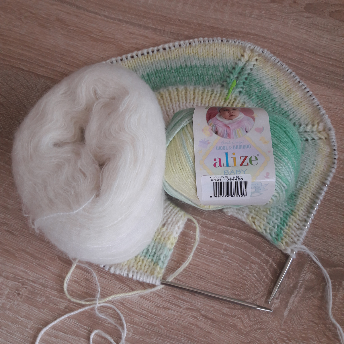 Все, что я вязала для внучки, стало маловато. Естественно, надо что-то новенькое. Вот так и начала простую кофточку, которую можно будет и осенью носить и зимой под куртку. Давно лежат у меня остатки пряжи от магазина и среди них две упаковки Беби Вул Батик от Ализе. Расцветка бело-желто-зеленая. Для тепла и легкой пушистости добавила тонкую (1000/100) нить беби альпаки белого цвета. Заодно и пестроту сгладит. Ничего нового я придумывать не стала, т.к. пока еще есть возможность вязать на улице во время прогулок. Да и пряжа с короткими цветовыми секциями не особо располагает к узорам. Набор итальянский эластичный (качели). На резинке меняла размер спиц от 3 до 4 Реглан сверху, росток от горловины Регланная линия, уже не раз я использовала такую, решила добавить изнаночную петлю в центре Планка будет цельновязаной, отверстие для пуговиц Просто с заботой и любовью от бабушки!