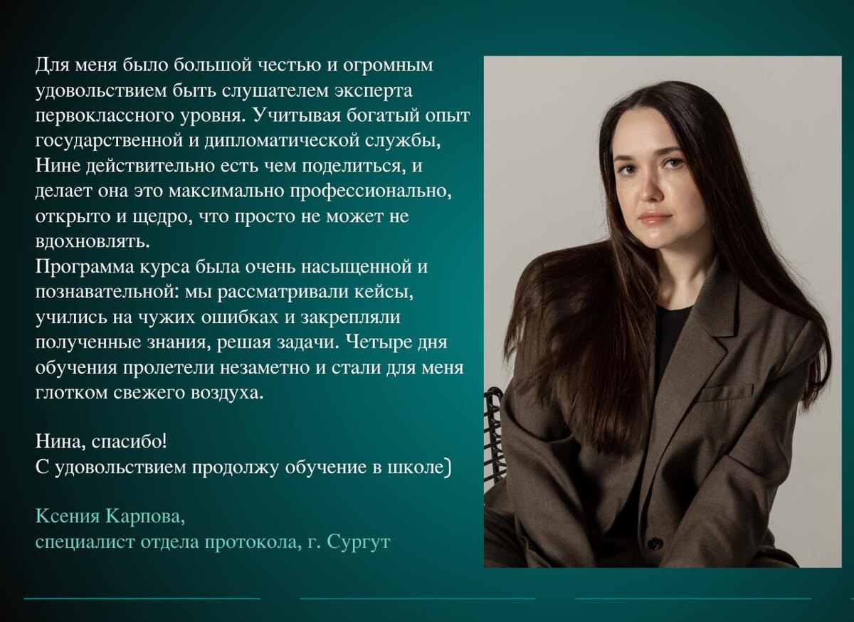 Отзывы учеников и формы обратной связи — это то, чего особенно ждёшь после проведения каждой программы. И не важно, первая это программа или сто первая (в моем случае, если считать корпоративные, то где-то так, наверное). Некоторые ученики ещё досматривают курс «Протокол и деловая коммуникация в работе личных ассистентов, помощников и секретарей» в записи, и анонимная форма обратной связи, которой я уже делилась с вами, пополняется новыми оценками и комментариями. Но особую ценность, конечно, имеют отзывы, которые ученики разрешают публиковать. Эти отзывы — важный мостик доверия между потенциальными новыми учениками, которые мало знают обо мне и в основном знакомы со мной по постам в Телеграме или по коротким видео на YouTube и в запрещённой соцсети. «Для меня было большой честью и огромным удовольствием быть слушателем эксперта первоклассного уровня. Учитывая богатый опыт государственной и дипломатической службы, Нине действительно есть чем поделиться и делает она это максимально п