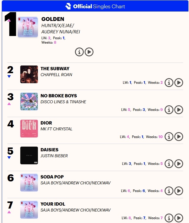 первого места британского топ-100. Но путь к вершине был далеко не мгновенным — это история упорства и фанатской любви. 93 позиции, затем постепенно набирала обороты: Такой рост — отличный пример того, как песня может возвращаться и снова завоевывать сердца слушателей. Невероятно наблюдать, как «Golden» (Golden) постепенно превращался из скрытой жемчужины в национальный хит. ✔ Наша группа ВК заходите и подписывайтесь: 👉 Kpop Idol 💽 ТОП-20 трендовых MUST-HAVE товаров для 🤘 K-POP фанатов - Успей заказать >>>