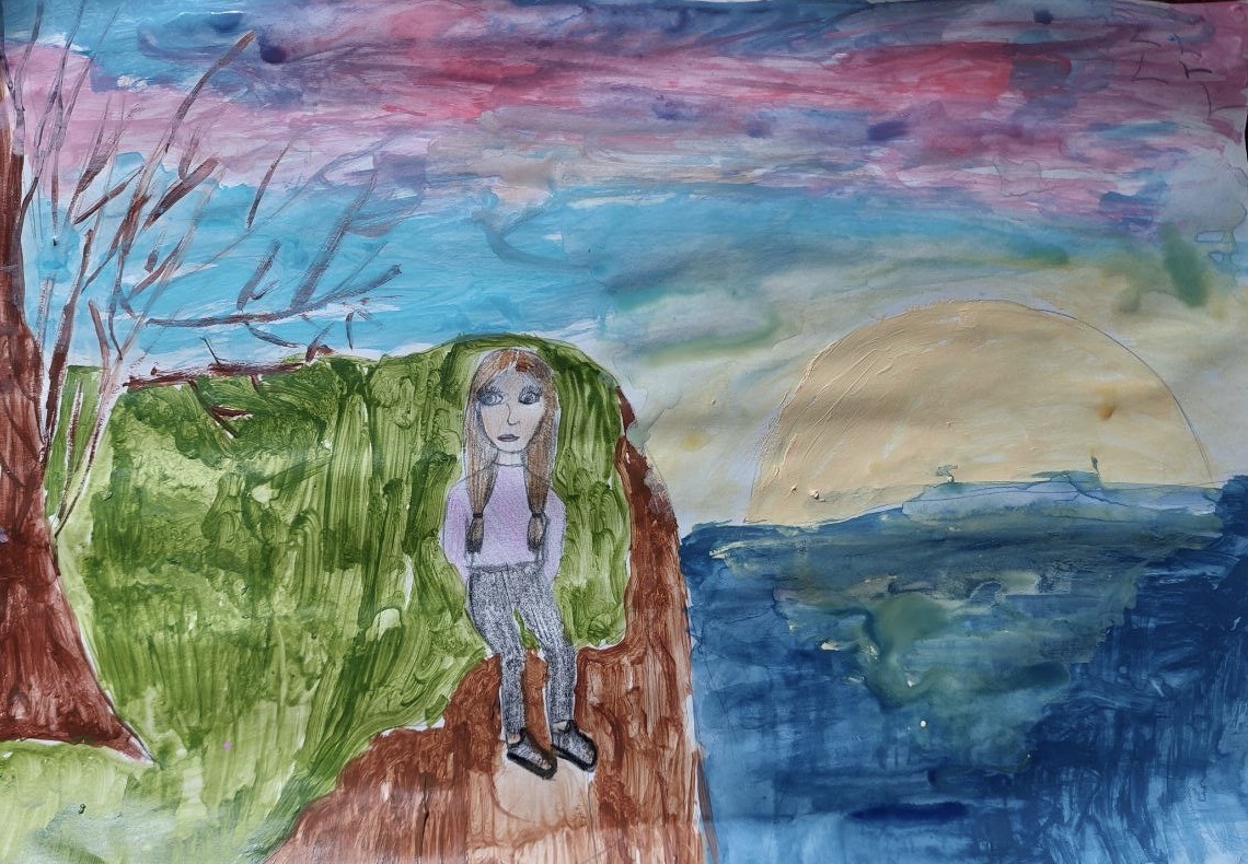 Иногда то, что словами не расскажешь, легко проявляется в линии, цвете и форме. Рисунок становится своего рода языком души, он помогает детям, и взрослым выразить переживания, снизить напряжение, увидеть скрытые смыслы и ресурсы. Через него мы можем глубже понять внутреннее состояние и наметить шаги к переменам. Наш рисунок сегодня разделен на два полюса: слева — зеленая земля с фигурой человека, справа — широкая небесно-водная зона с диском солнца (или луны). Вертикаль деления заметна, фигура как бы стоит на границе двух миров. Это может отражать переживание между разными состояниями, событиями, решениями. Персонаж помещен не в центр, а в левую часть, наше зрительское внимание сначала идет к фигуре, а затем скользит в пространство неба и воды. Такое смещение часто связано с чувством неполного включения в окружающую среду или ожиданием чего-то из внешнего мира. Зеленый массив слева — густой, теплый, с наложением коричневого. Это зона опоры, безопасности, материального или телесного.