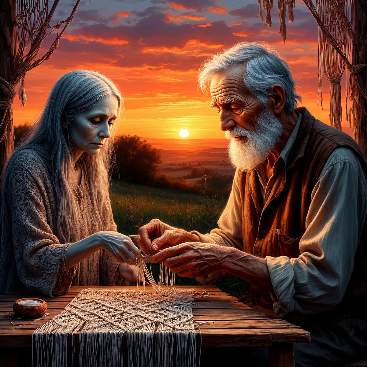 Седой старик плетет макраме, в память о своей жене.