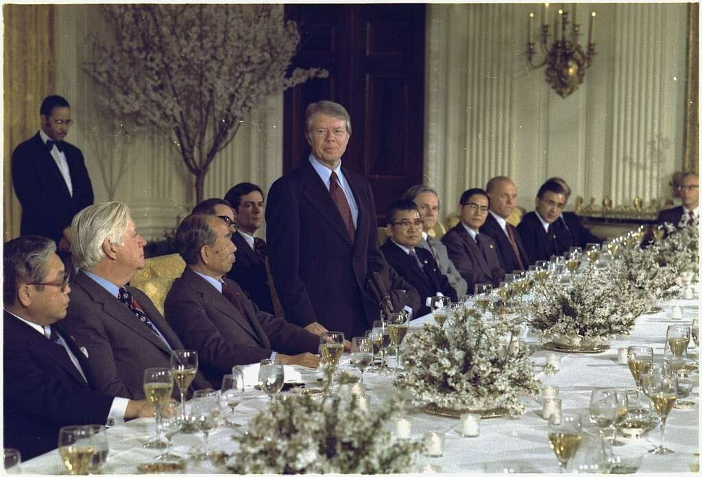 Джимми Картер на фото: даёт обед премьер-министру Японии Такэо Фукусиме, 1977 год.