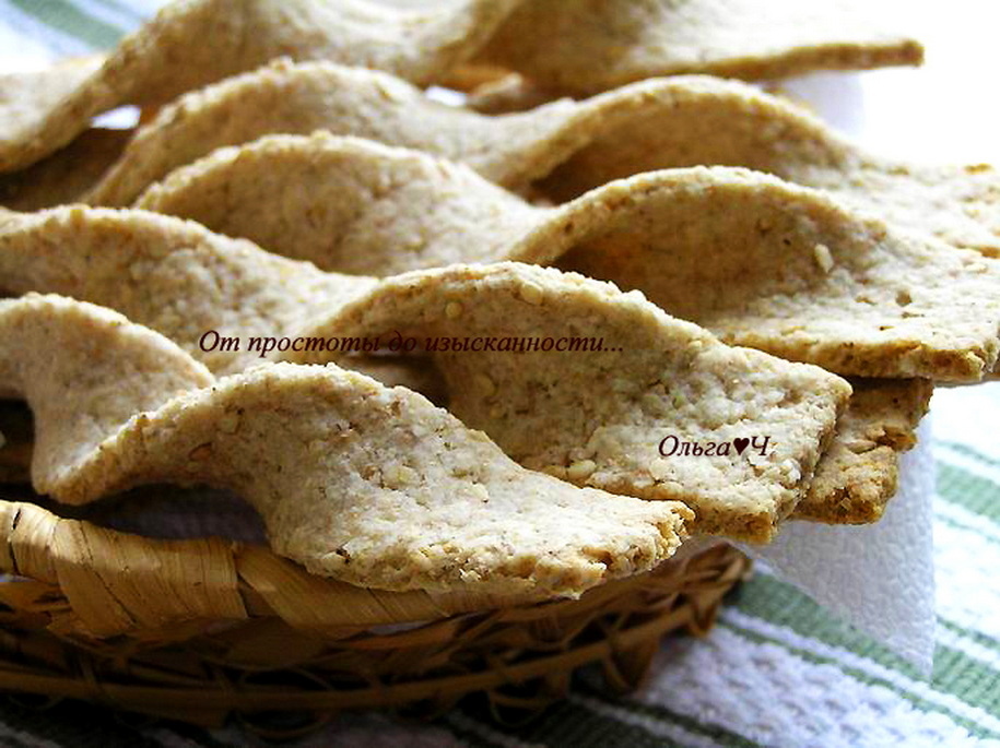 1/2 ч. л. разрыхлителя Приготовление: Смешайте муку, измельченные хлопья, соль, кунжут и разрыхлитель. В отдельной посуде смешайте воду с маслом. Добавьте сухую смесь, перемешайте. Замесите тесто руками. Тесто тонко раскатайте, нарежьте длинными полосками. Каждую полоску дважды перекрутите, переложите на противень, застеленный бумагой для выпечки. Выпекайте при 180*С около 20 минут. Остудите. Подавайте к столу. Приятного аппетита! Вам также могут понравиться: