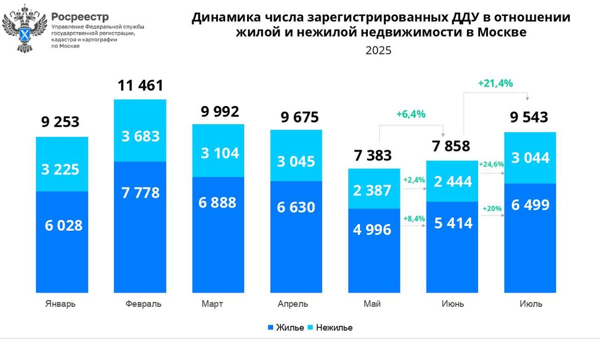 Первичный рынок недвижимости Москвы растет второй месяц подряд В июле 2025 года Управлением Росреестра по Москве зарегистрировано 9 543 договора участия в долевом строительстве в отношении жилой и нежилой недвижимости, что на 21,4% больше результата июня текущего года (7 858 ДДУ). 📈 Рост числа первичных договоров наблюдается в столице второй месяц подряд, сообщил Игорь Майданов, руководитель Управления Росреестра по Москве. «Объем зарегистрированных сделок в строящихся домах второй месяц подряд демонстрирует положительную динамику. Так, в июне текущего года было оформлено на 6% больше первичных договоров, чем в мае, в июле — уже на 21% выше, чем в предыдущий месяц. При этом кратный рост зарегистрированных ДДУ фиксируется как в сегменте жилья (+8% июнь к маю; +20% июль к июню), так и с нежилой недвижимостью (на 2% июнь превзошел май, почти на 25% июль — июнь)» В годовом выражении зафиксировано снижение к июлю 2024 года (11 506 ДДУ) на 17,1%. К аналогичному месяцу 2023 года (11 943
