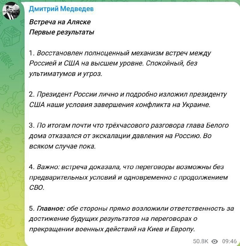 Сложно представить, что закладывал рынок, но как будто надо было спекулятивные позиции продать вчера днем😂 Покупай на ожидании, продавай на новостях. Сейчас весь мир (какая то не малая его часть) будет обсуждать: "Ага, ничего не закончено. Война будет продолжаться Переговоры провалились" Мои мысли и ощущения: 1. Я давно не видел таких масштабных шоу, в лучшем смысле этого слова. Как разгоняли встречу, как встречались на дорожке красной. И т.д. и т.п. Этого, скажем честно, не было очень давно. 2. Глупо было ожидать, что выйдет Путин к трибуне, и сообщит, что отдал приказ остановить СВО. Из заявлений официальных лиц, не разит, что пошло, что-то не так. 3. Мяч на стороне Украины и Европы. То есть, Россия - США свою позицию согласовали. Она на общих нотах. 4. Прекратил риторику про санкции и давление. На мой взгляд делитанта, это очень позитивно. Но, на рынке я не один. Посмотрим как на безликвидных торгах выходного дня, будут гонять котировки вниз.