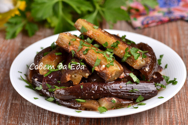 Отличный быстрый способ приготовления без рассола. Такие закусочные баклажаны настаиваются всего 2 часа. Они очень вкусные, так как наполенены ароматами и вкусами специй и зелени. Готовить очень легко и просто. Это прекрасная сочная закуска. Порции 4 Время подготовки 20 минут Время приготовления 2 часа Ингредиенты Инструкции 1. Берем баклажаны среднего размера. С двух сторон отрезаем "хвостики". Выкладываем баклажаны в кипящую подсоленную воду (объем кастрюли 3 литра) и варим на среднем огне 10 минут. Периодически переворачиваем на разные стороны. 2. Баклажаны перекладываем на тарелку. Баклажаны за 10 минут полностью не приготовятся, они становятся немного мягкими, хорошо держат форму, кожица сморщивается. 3. В миске перемешиваем растительное масло без запаха, уксус, соль (2 щепотки), сахар, пропущенный через пресс чеснок и специи (у меня 1/2 ч. л. сладкой паприки, 1/2 ч. л. молотого кориандра и 1/4 ч. л. черного перца). 4. Пока готовили маринад, баклажаны немного остыли. Разрезаем