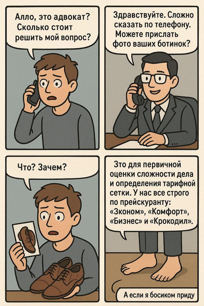 Ценообразование адвоката — Алло, это адвокат? Сколько стоит решить мой вопрос? — Здравствуйте. Сложно сказать по телефону. Можете прислать фото ваших ботинок? — Что? Зачем? — Это для первичной оценки сложности дела и определения тарифной сетки. У нас все строго по прейскуранту: «Эконом», «Комфорт», «Бизнес» и «Крокодил». — А если я босиком приду? — Тогда консультация бесплатная. Но и шансы на успех... босые. Подробнее и не только шутки обсудили на вебинаре по ценообразованию https://urfaq.com/webinary/tpost/m01anc54u1-skolko-zarabativayut-advokati