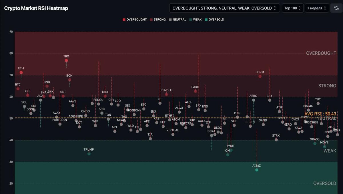 Вертикальные пунктирные линии это изменения за неделю. Видно как хорошо остудили некоторые альткоины, например такие как PENGU, SPX или ENA.