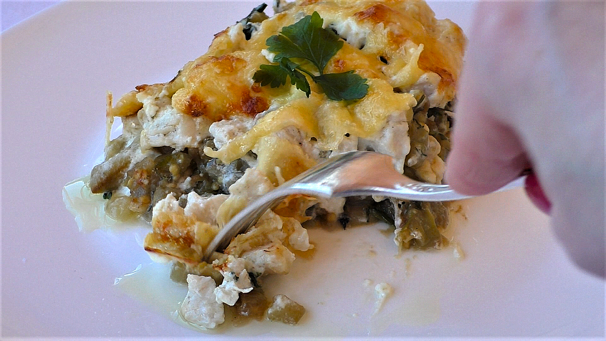 Этот рецепт я нашла в книге грузинской кухни. Удивительно, но это не совсем традиционное кавказское блюдо: в нём нет привычных специй, только зелень. Вчера приготовила, сегодня повторила. Это невероятно вкусно! Спасибо всем, кто делится моими рецептами в соцсетях, ставит лайки и комментирует. 1. Для этого блюда понадобятся баклажаны. Очищаю их от кожицы и нарезаю тонкими брусочками. 2. Выкладываю баклажаны в посуду, посыпаю солью, перемешиваю и оставляю на 10–15 минут. 3. Мелко режу репчатый лук. 4. Куриную грудку нарезаю так же, как и баклажаны. Ещё нам понадобится натёртый на крупной тёрке сыр, зелень (у меня укроп, кинза, петрушка и базилик) и сметана. Все ингредиенты подготовлены. Разогреваю сковороду с подсолнечным маслом, выкладываю куриную грудку, солю и перчу. Обжариваю до готовности, постоянно помешивая. Готовую грудку убираю. На сковороду кладу лук, обжариваю до полуготовности, добавляю отжатые баклажаны и готовлю до мягкости. В конце добавляю зелень и всё хорошо перемешиваю