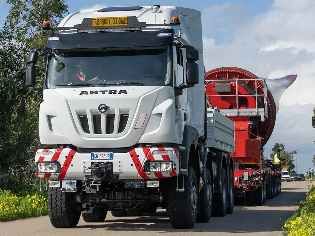 Под деревней Мезань, на юге Италии, завершаются работы по созданию новой ветряной электростанции, состоящей из девяти турбин высотой 118 метров. По этому случаю на местных дорогах можно было встретить очень интересные наборы, выделяющиеся даже для индустрии сверхнормативного транспорта. Речь идет об оборудовании, принадлежащем транспортной компании GeoTrasporti из Рима, которой было поручено перевозить в общей сложности 27 лопастей роторов, по 81 метр каждая. На фотографии выше, сделанной именно по случаю этого проекта, мы можем увидеть балластный трактор Astra HD9 8657, один из двух, полученных GeoTrasporti прошлой осенью. Здесь я сразу объясню, что Astra-это бренд, принадлежащий группе Iveco, но специализирующийся на производстве автомобилей для самых требовательных применений. Это также модель HD9 8657, технически приспособленная для работы в 500-тонных комплектах. Таким образом, хотя визуально он может напоминать Iveco Stralis, а также использует хорошо известный двигатель Cursor 1
