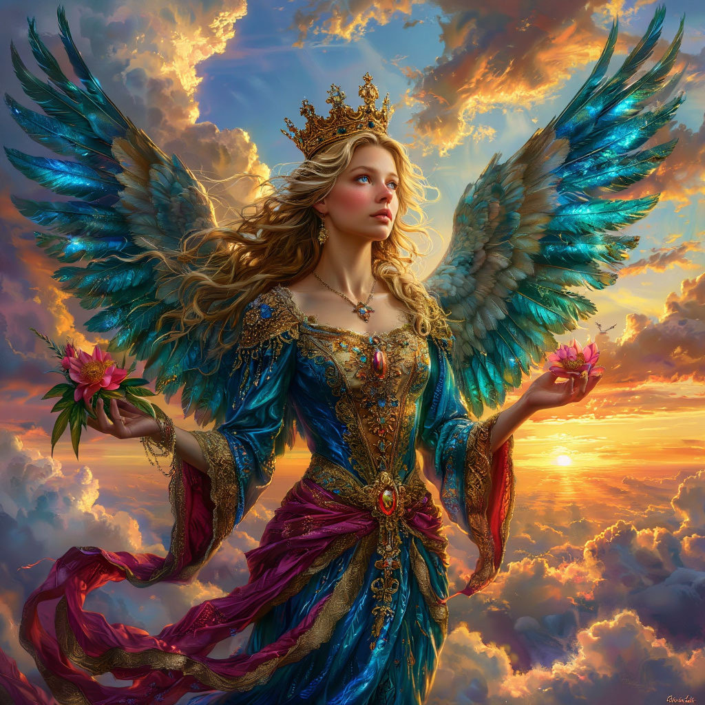 Алконост была особенной: на её голове сияла золотая корона, украшенная самоцветами, а в руках она держала райские цветы и свиток с древними письменами. Её глаза светились неземным светом, а крылья переливались всеми цветами радуги. Когда она взлетала, вокруг неё образовывалась светящаяся аура, а воздух наполнялся ароматом цветущих садов.
