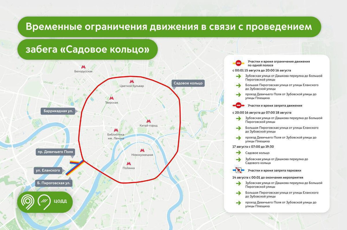 🛑 Садовое кольцо закроют 17 августа из-за проведения спортивного забега С 07:00 до 19:30 ограничат движение на всем протяжении Садового кольца в оба направления, а также на Зубовской улице - от Дашкова переулка до Садового кольца.