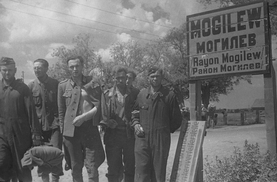 Утром 28 июня мы вышли ш Луполова (предместья Могилева), занятого нашими войсками накануне, и двинулись в город. Могилев стоит на возвышенном правом берегу Днепра. Летнее солнце освещает, сейчас его печальные строения — каменные стены без крыш и окон, обезглавленную каланчу, мертвые руины. Гарь пожаров стелется по городу: горит теплоэлектроцентраль, горит почта, продолжается пожар на железнодорожном узле.