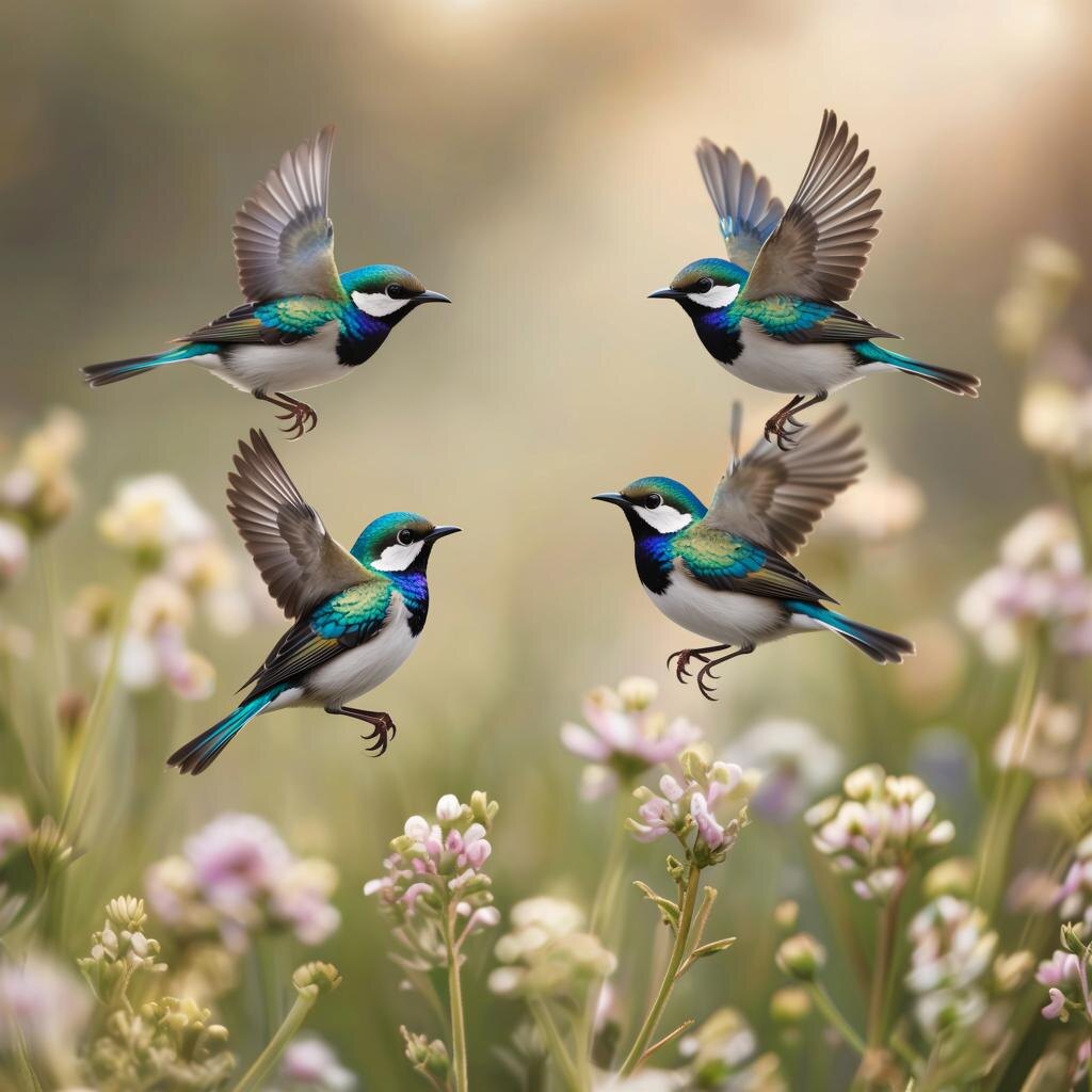 o Над поляной пронеслась стайка крошечных птиц. Они были ослепительны: перья переливались всеми цветами радуги – изумрудные, сапфировые, огненно-рыжие. Их крылья мелькали так быстро, что казались прозрачным сиянием. Они порхали, зависая в воздухе у цветов, но не садились на ветки, как знакомые синицы или воробьи. Их песня, хоть и прекрасная, звучала чуждо и непонятно.