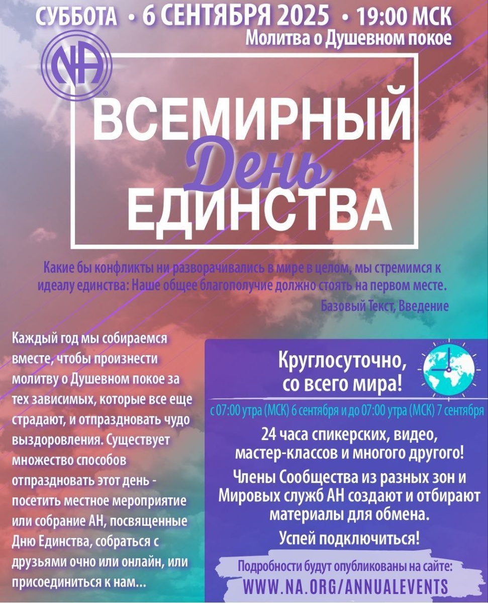 Привет, семья. Все вы знаете, а если не знали, то сейчас узнаете, что каждый год наше сообщество проводит день единства. Что это значит спросите вы? А мы ответим, по всему миру проводятся мероприятия посвящённый единству в АН. Мероприятия большие или маленькие не важно, главное чтобы они были направленные на единство в АН и напоминали всем нам об этом. На большинстве наших собраний мы читаем такую фразу "несмотря на то, что нам не всё нравится, главно, что мы любим друг друга". И самое главная фишка этого мероприятия в том, что все кто считает себя членом АН может присоединиться к молитве о душевном спокойствии в любой точке мира. По всему миру члены АН одновременно молятся нашей молитвой, каждый из нас может почувствовать эту силу и любовь. Всемирная день единства АН проводятся в первый выходные сентября, в этом году это 6 сентября. Естественно мы готовим небольшое развлекательное мероприятие по этому поводу. Место и время будет позднее. Но уже сейчас ты можешь запланировать себе вс